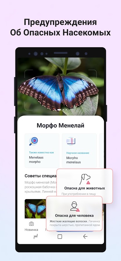 Приложение Picture Insect Bug Identifier в сотрудничестве с экспертами отвечает на часто задаваемые вопросы. Что ест голубая бабочка морфо? Как долго живет насекомое? Какие у паука враги? Вредно ли это насекомое для человека? Только спросите — специалисты готовы дать ответы.
