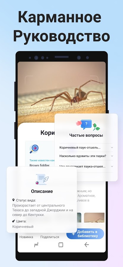 Это универсальный распознаватель пауков, бабочек и других насекомых. Благодаря удобному интерфейсу все, что нужно, это сделать фото, которое вы хотите распознать, и приложение предоставит всю информацию об этом насекомом.