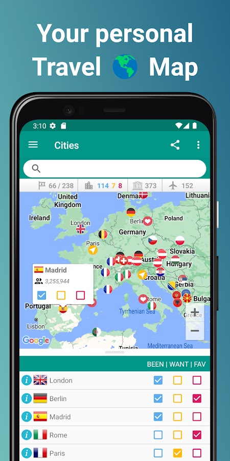 Приложение автоматически генерирует список всех посещенных стран и штатов/провинций/регионов на основе отмеченных вами городов. Это также поможет вам отслеживать ваш личный список желаний — все места, которые вы еще планируете посетить, и ваши любимые места в мире.