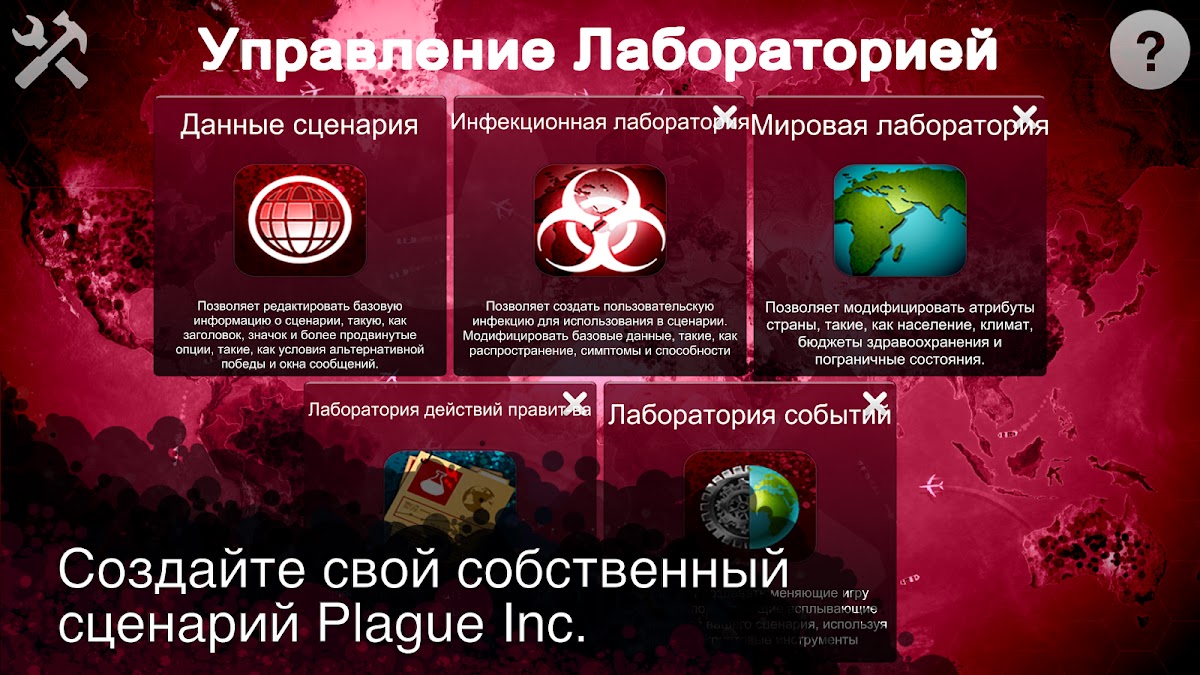 Задействуйте лабораторию и используйте мощный и удобный инструмент — разрабатывайте свои собственные уникальные сценарии для Plague Inc. Создавайте новые виды болезней, миры, события и много чего еще, а потом поделитесь всем этим со своими друзьями и 85 миллионами любителей этой игры!