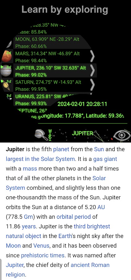 Вы можете искать небожителей и исследовать Солнечную систему в 3D. С помощью астрономического компаса вы получаете мгновенный обзор небесных тел вокруг вас и над вашим горизонтом.