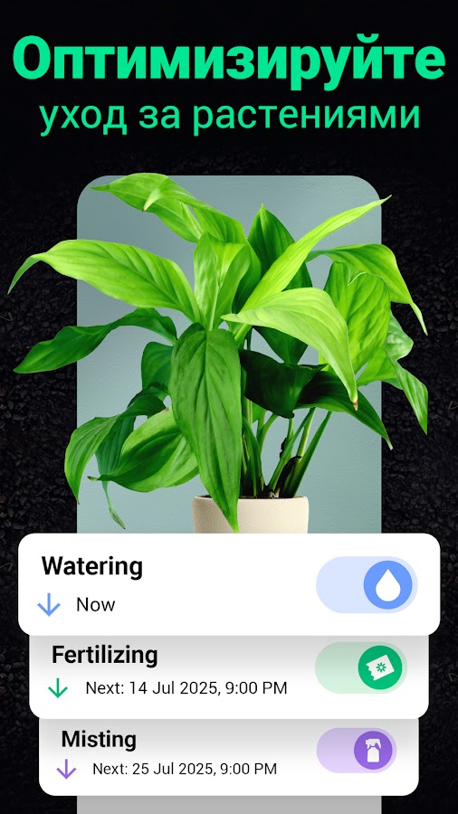 Своевременно получайте информацию о том, сколько воды, света и удобрений необходимо вашему комнатному растению, чтобы оставаться здоровым. С Plantum ни один вопрос не останется без ответа — все, что вам нужно знать об уходе за растениями, вы найдете в приложении (и даже немножко больше).
