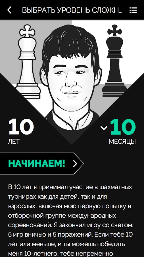 Приложение снабжено специально разработанным шахматным движком, имитирующим стиль игры Магнуса. С 28-летним Карлсеном сладить будет непросто, зато против 5-летнего твои шансы резко возрастут. Со временем ты получше узнаешь личность твоего соперника и привыкнешь к его эпизодическим колким комментариям.