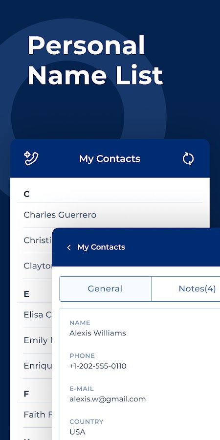 Name List — список ваших деловых контактов. Синхронизируйте свой список контактов с приложением и общаться с вашими контактами! Добавьте заметки к контактам, чтобы запомнить все детали вашего общения. Добавьте сообщения и результаты после звонков. Добавьте напоминания, и приложение будет напоминать вам, чтобы следить за вашими деловыми контактами.
