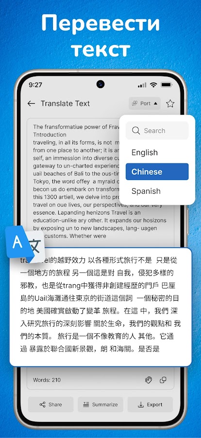 Копируйте текст, экспортируйте в форматах .txt или .pdf или сохраняйте его непосредственно на устройстве или в облачном хранилище.