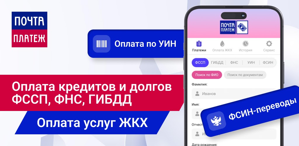 Почта-Платеж.рф – банк финуслуг, предоставляет доступ к полному спектру платежных услуг онлайн, в том числе для оплаты долгов в государственные структуры. Совершайте платежи прямо с вашего смартфона, быстро и безопасно!