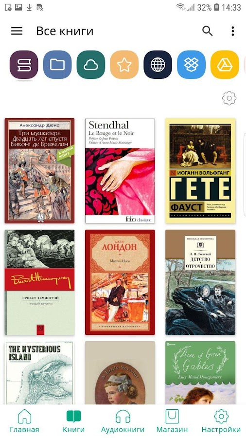 • Ваши книги с сервисов Dropbox, Google Drive, Google Books легко и быстро подключаются к приложению, чтобы создать одну общую библиотеку. Вы даже можете подключать несколько аккаунтов одного сервиса одновременно;