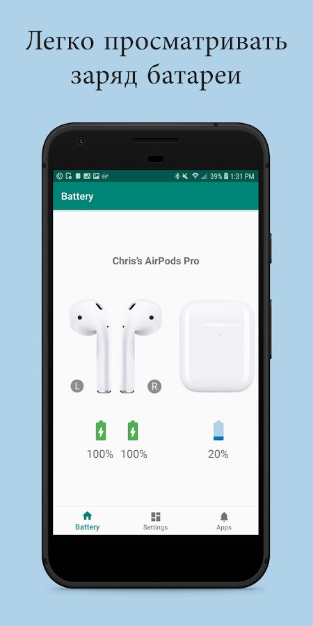 Приложение «PodAir — Уровень заряда батареи AirPods» позволяет пользователям Android просто и легко просматривать уровень заряда батареи в Apple AirPods и их чехле.