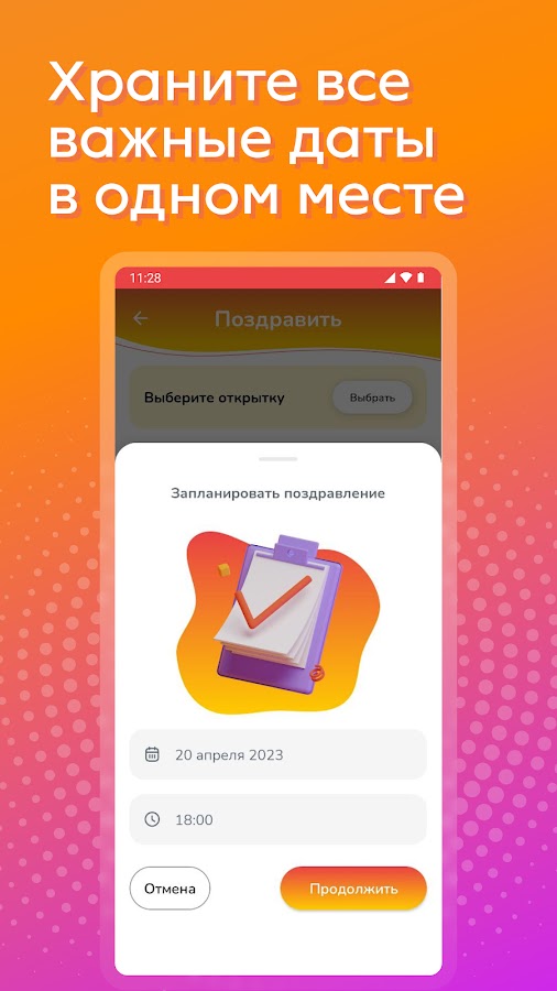 Мы сделали всё, чтобы вы не тратили много времени на поздравления: постоянно обновляем базу открыток, актуальных подарков и удобных фичей. Оцените все возможности приложения!