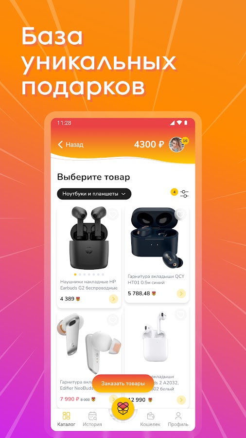 Индивидуальная и групповая отправка подарков. В приложении внедрена специальная система поиска уникальных и профессиональных подарков.