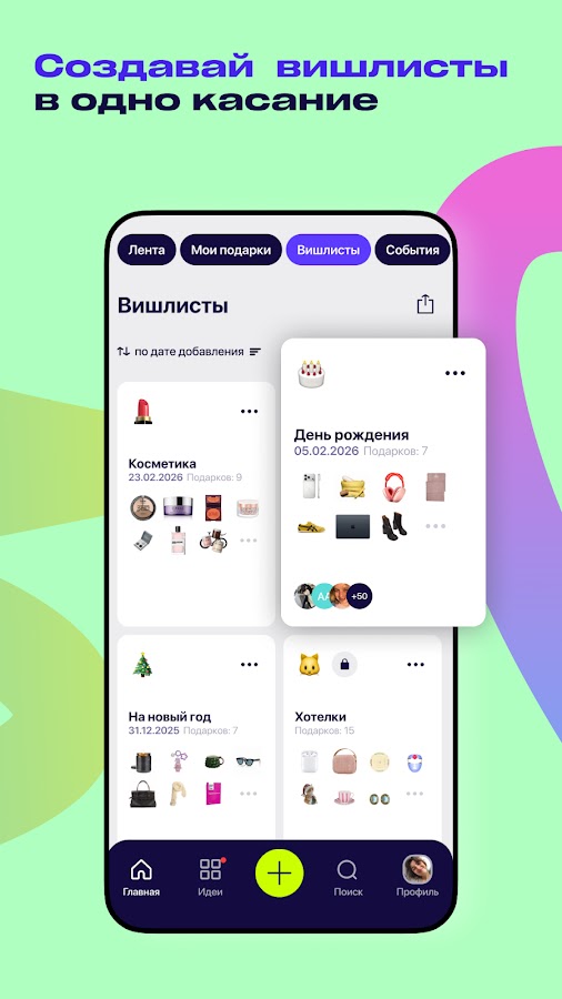 Создавай вишлист (wishlist) и делись со своими друзьями и близкими. С готовыми списками подарков вашим гостям больше не придется гадать, что подарить вам на день рождения, свадьбу, новоселье или новый год.