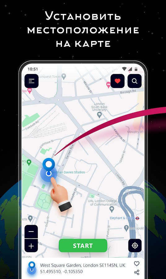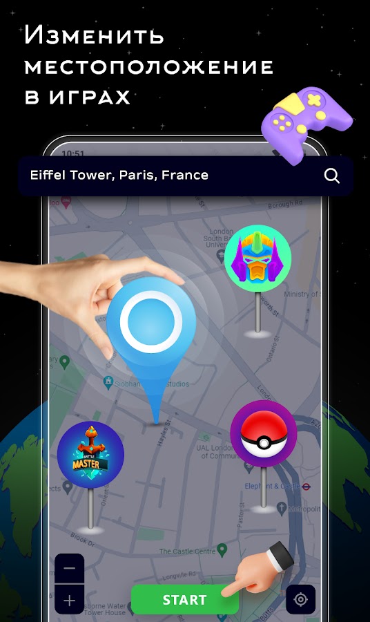 Найдите нужное место на карте и нажмите «Старт», чтобы сразу сменить локацию.