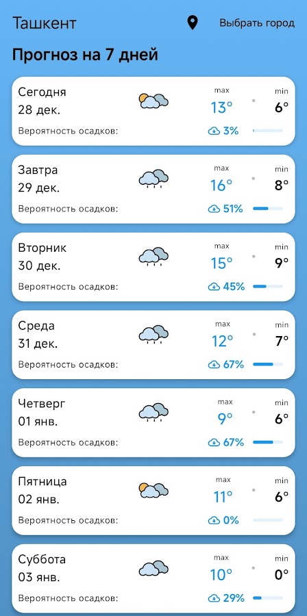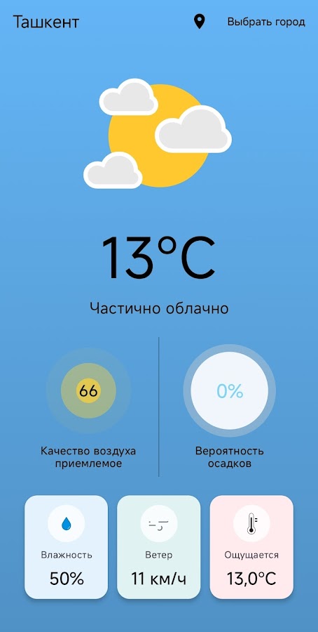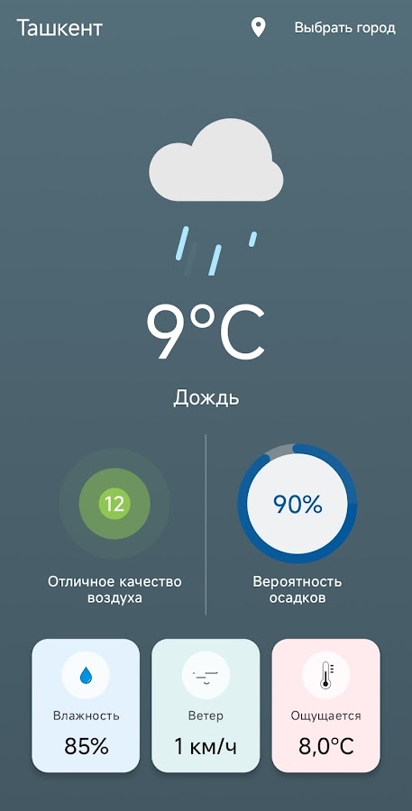 Приложение «Погода Узбекистана» показывает актуальный прогноз погоды по всем регионам и городам страны.