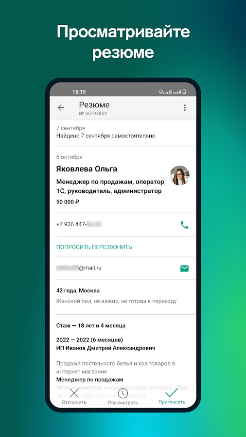 • Приглашение на собеседование: назначайте интервью лучшим претендентам. Писать и звонить кандидатам можно прямо из приложения.