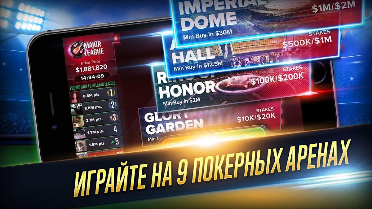 Девять разных стадионов с собственным покерным стилем и настроением! Начните на игровой площадке для начинающих, пройдите через Клеть победы и перейдите на Ринг чести – чтобы стать истинным профессионалом в покер. Просматривайте статистику игроков, данные о силе руки, увлекательную анимацию и многое другое! Найдите скидки в магазине фишек, чтобы сразу же купить фишки по минимальной цене!