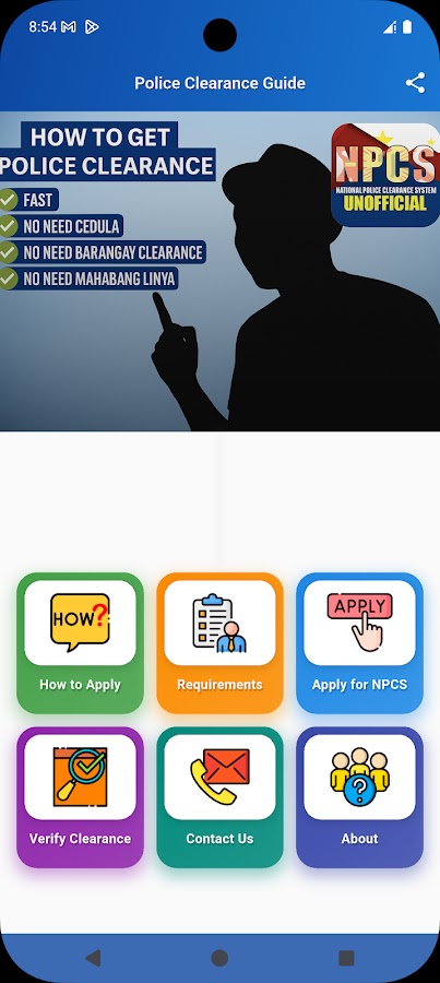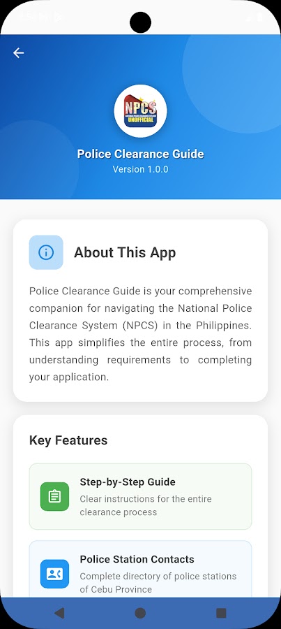 Это мобильное приложение Police Clearance Guide является ЧАСТНЫМ приложением, НЕ СВЯЗАННЫМ С ПРАВИТЕЛЬСТВОМ ФИЛИППИНЫ. Он создан, чтобы помочь вам сориентироваться в процессе получения разрешения полиции на Филиппинах. Информация, представленная в этом приложении, получена с официального сайта правительства https://pnpclearance.ph/.
