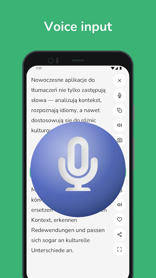• Распознавание голоса: говорите прямо в приложении, и наш искусственный интеллект мгновенно переведет вашу речь, делая разговор более плавным.
