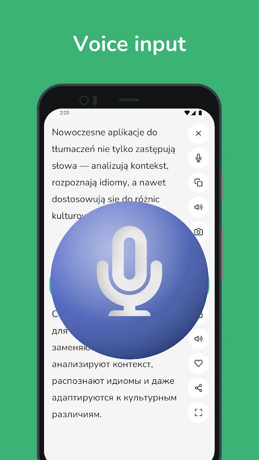 • Распознавание голоса: говорите прямо в приложении, и наш искусственный интеллект мгновенно переводит вашу речь, делая общение более плавным.