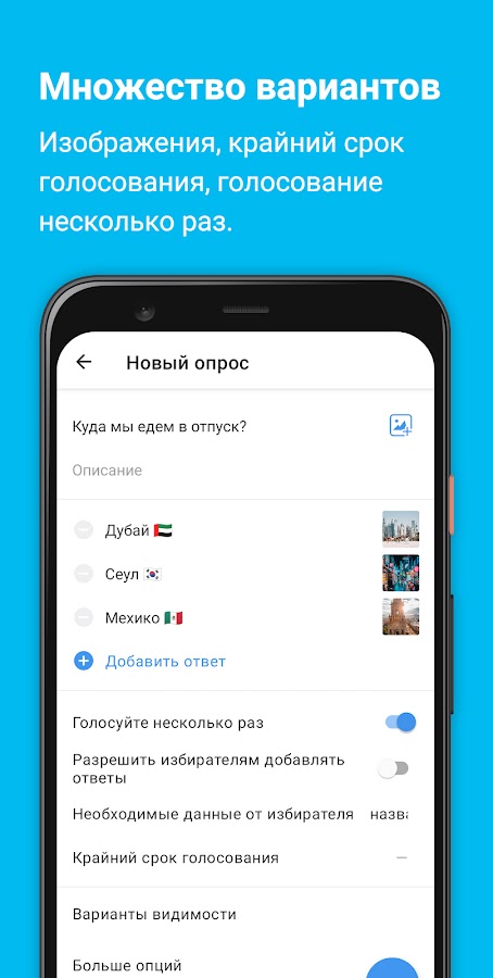 Опишите свой опрос, загрузите изображения, разрешите один или несколько голосов, установите дату закрытия и выберите, что увидят ваши пользователи.