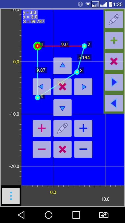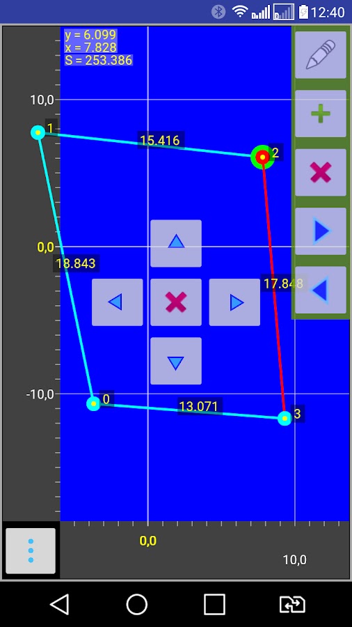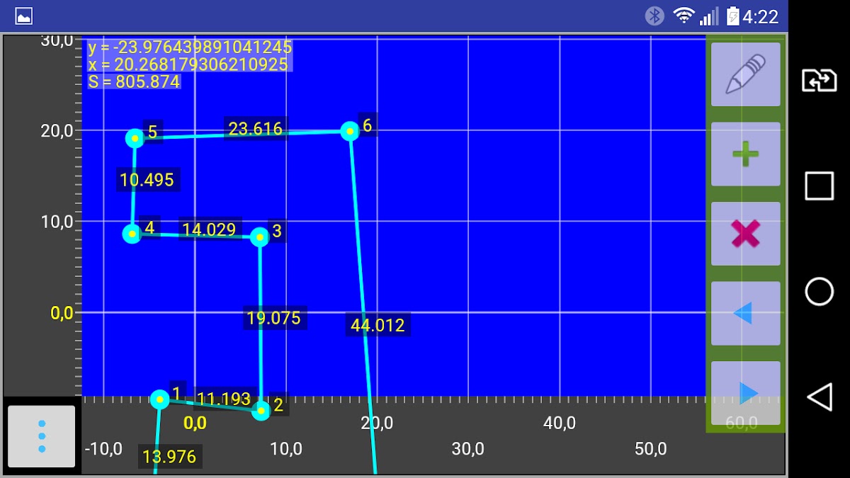 Программа позволяет построить графическое изображение многоугольника, установить точные значения координат его вершин и рассчитать площадь многоугольника, размеры сторон, углы и периметр.