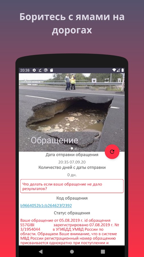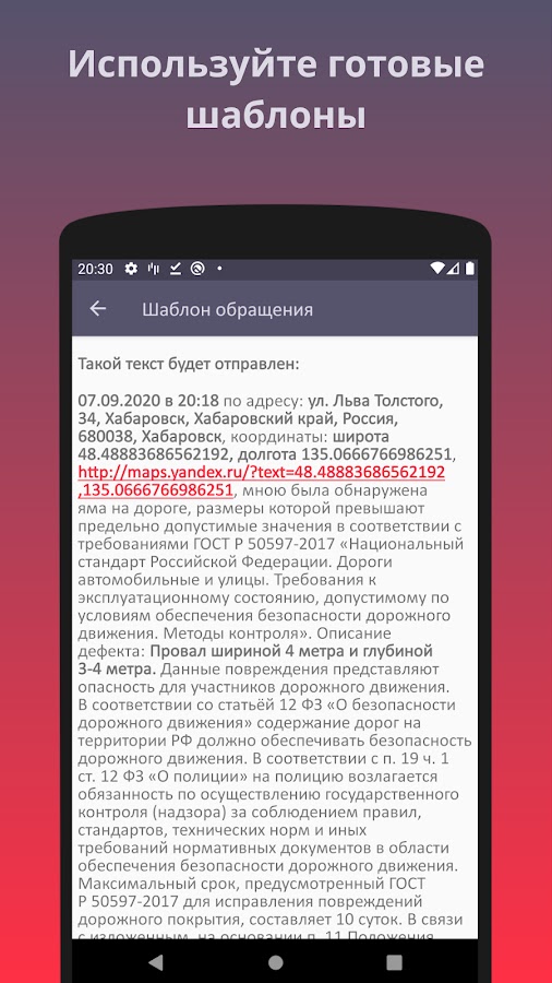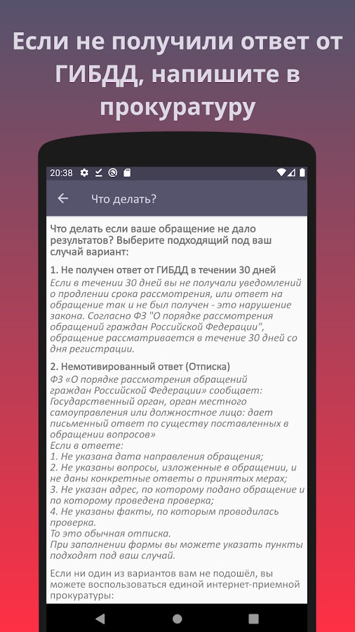 Основная функция приложения – помощь в формировании текста обращения для отправки через официальный сервис: https://гибдд.рф/request_main.