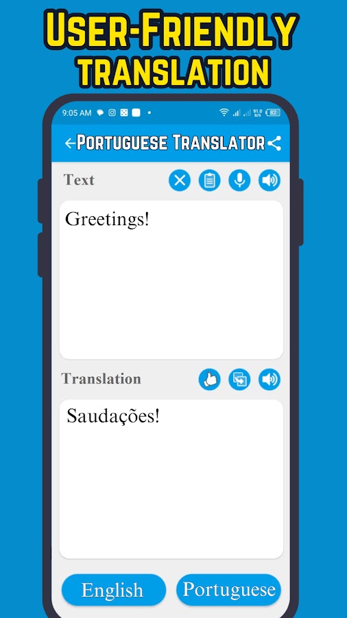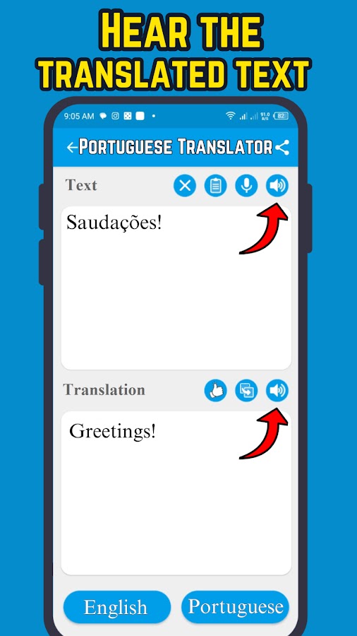 Ищете голосового переводчика с английского на португальский язык? Это бесплатное приложение позволяет легко и быстро переводить английский и португальский английский. Изучаете ли вы португальский английский язык, путешествуете или нуждаетесь в помощи в повседневном общении, воспользуйтесь этим конвертером с английского на португальский, это приложение-переводчик станет вашим идеальным помощником среди переводчиков всех языков.