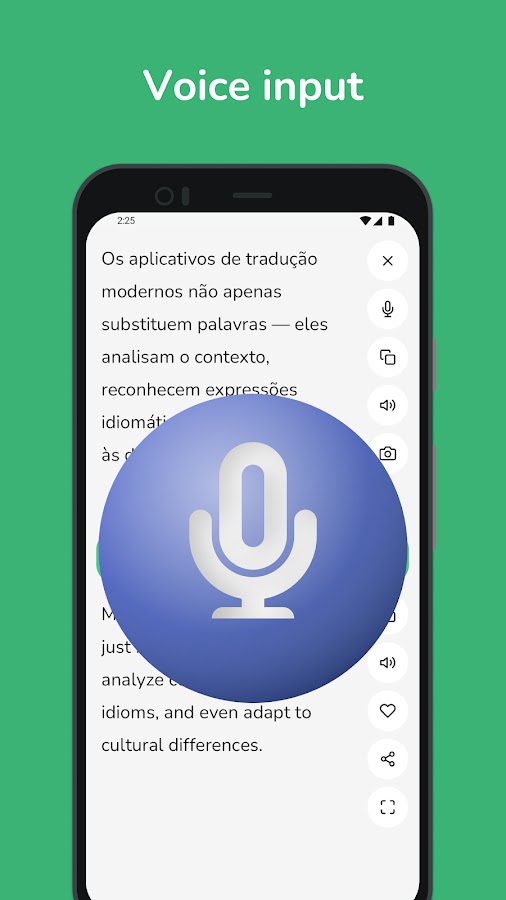 • Распознавание голоса: говорите прямо в приложении, и наш искусственный интеллект мгновенно переведет вашу речь, делая разговор более плавным.