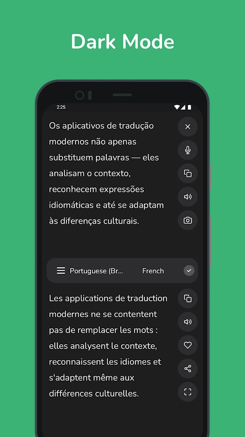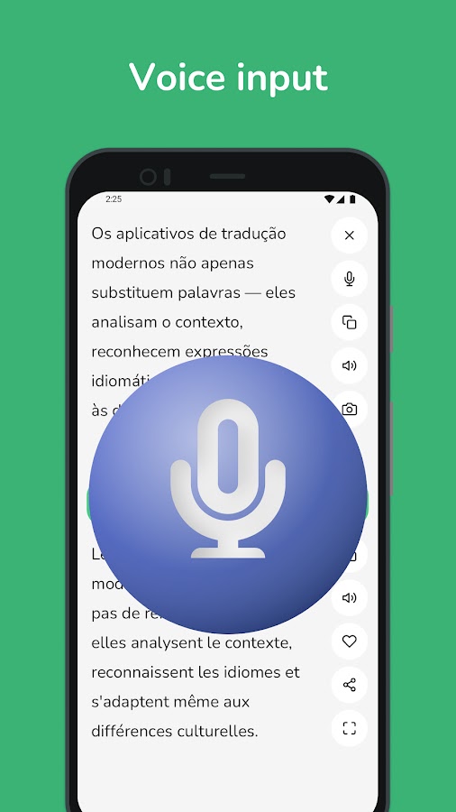 • Распознавание голоса: говорите прямо в приложении, и наш искусственный интеллект мгновенно переведет вашу речь, делая разговор более плавным.