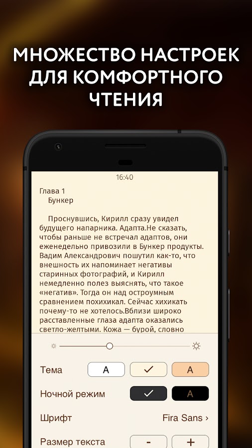 — Возможность настроить читалку под себя (шрифт, цвет, фон, размер текста)