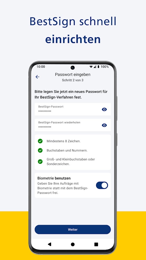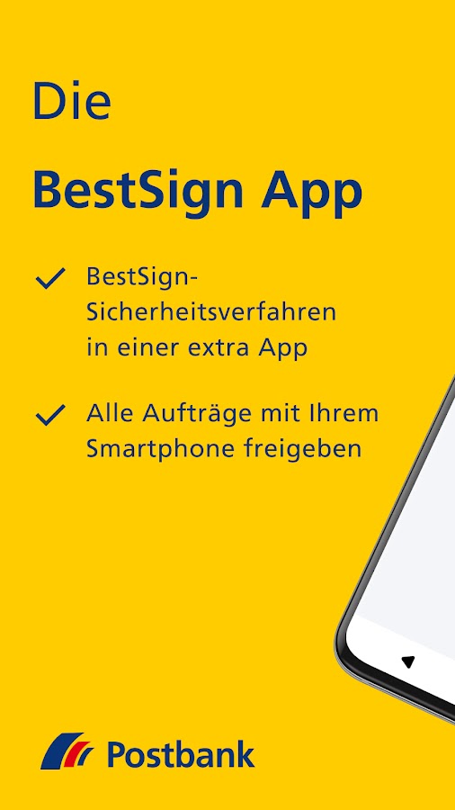 Приложение Postbank BestSign — это отдельное приложение для безопасного оформления заказов в онлайн-банке. Приложение включает только процедуру безопасности BestSign. Создайте BestSign один раз и активируйте его, после чего он будет готов к выпуску.