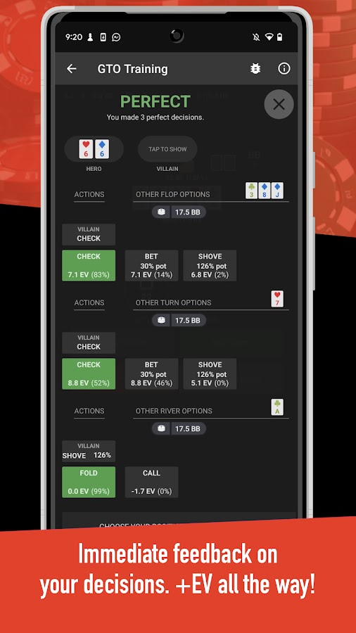 Вот как это работает. Просто выберите PIO решенное место и нажмите Play. Затем Postflop+ подарит вам руку и позволит вам принимать решения GTO с учетом формирования, действия и т. Д. Как только вы выбираете действие, вы получаете немедленную обратную связь GTO, оптимальную частоту для ставок / чеков и оптимальный размер для использования. Ответ основан на высокой точности решения, которое запущено и доступно готово к работе!