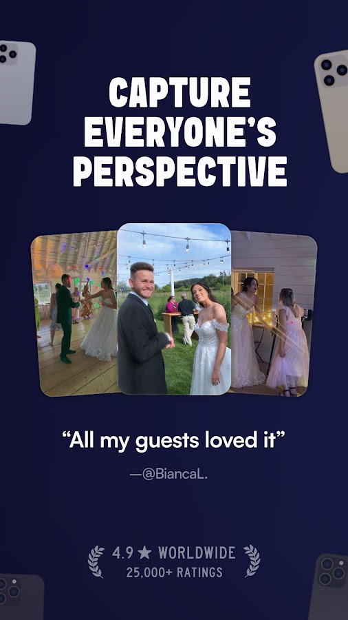 POV поможет вам запечатлеть точку зрения каждого участника вашего мероприятия. Идеально подходит для свадеб, дней рождения, вечеринок по случаю 15-летия, выпускных, девичников и многого другого.