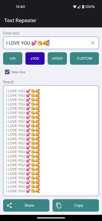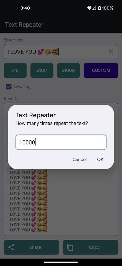 Повторитель текста — ваше идеальное приложение для плавного, эффективного и безопасного повторения текста или слов. Наше приложение предназначено для легкого копирования текста на основе указанного вами количества — будь то 10, 100, 1000, 10000 или любое другое число до 10000.