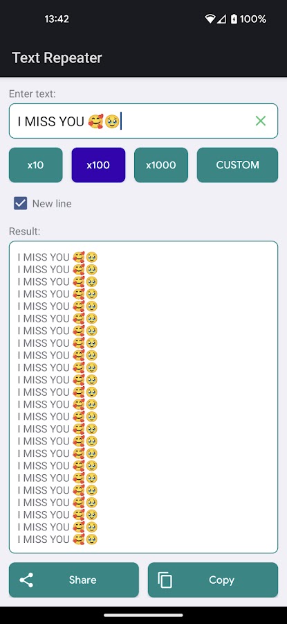 Использовать повторитель текста очень просто. Просто введите текст, который хотите дублировать, и укажите желаемое количество повторов. Приложение мгновенно генерирует дублированный текст, которым вы можете легко поделиться или скопировать в буфер обмена для использования в различных контекстах.