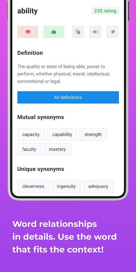 * Огромный словарный запас: доступ к более чем 300 миллионам английских синонимов, антонимов и определений