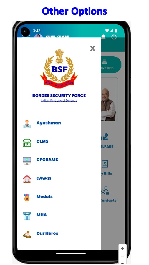 Это приложение разработано ИТ-подразделением BSF для сотрудников BSF, чтобы облегчить им работу с единой платформы. Сотрудники BSF могут изучать Ayushman, CLMS, CpGrams, eAwas, Welfare, Recruitment, а также личные данные, такие как оплата, GPF, биоданные, история отпусков, порядок увольнений, мои счета, используя эту единую платформу.