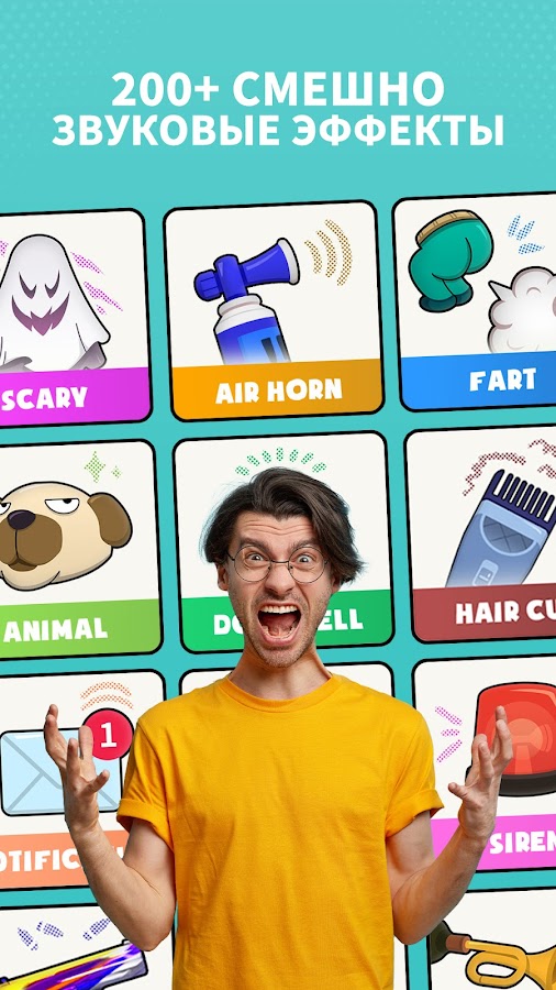 Симулятор звуков розыгрыша: стрижка, животное. ASMR, Взрыв, пердеж, пистолет, ужасы, мем, электрошокер, взлом. ужас, автомобильный гудок, дверной звонок, уведомление, сирена.