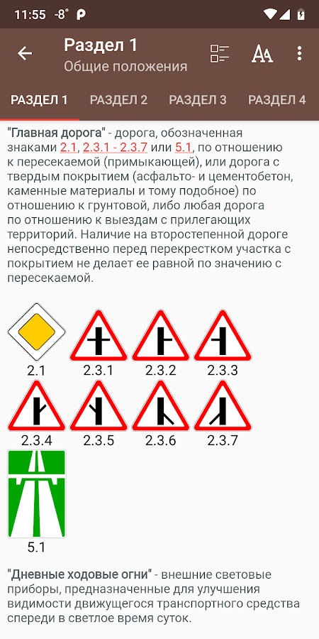 Приложение представляет собой удобный справочник по правилам дорожного движения (ПДД), дорожным знакам и разметке, штрафам за нарушение правил. Приложение содержит полный текст правил, актуальный на данный момент времени.