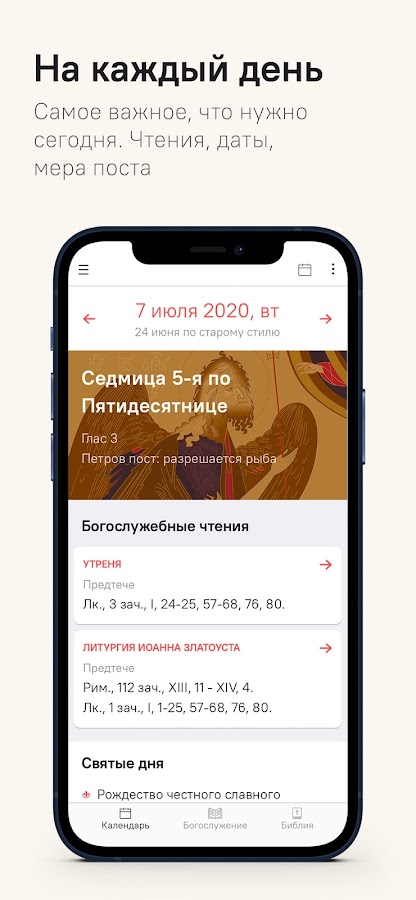 Приложение состоит из двух основных разделов — «Календарь» и «Богослужение».