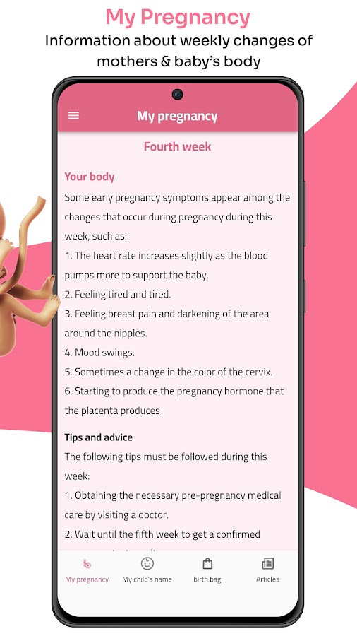 Приложение-калькулятор беременности также предоставляет сумку для родов для матери и ребенка, поскольку оно показывает вам список, содержимое которого вы можете изменить, чтобы подготовить сумку для родов, ничего не забывая.