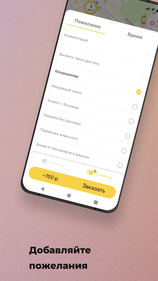 Добавьте к заказу дополнительные пожелания. Например, когда на улице +35 — выберите «кондиционер». Если вы не переносите запах табака — укажите «Некурящий салон», и к вам приедет некурящий водитель.