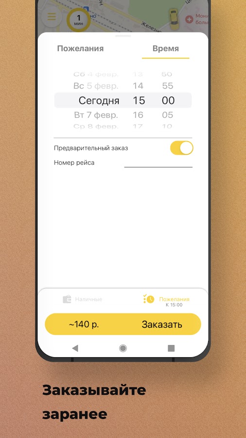 Выберите опцию “Предварительный заказ”. Поиск автомобиля начнется незадолго до заказа поездки, и автомобиль приедет к назначенному времени. Также вы будете заранее знать стоимость поездки.