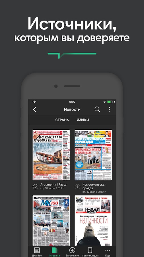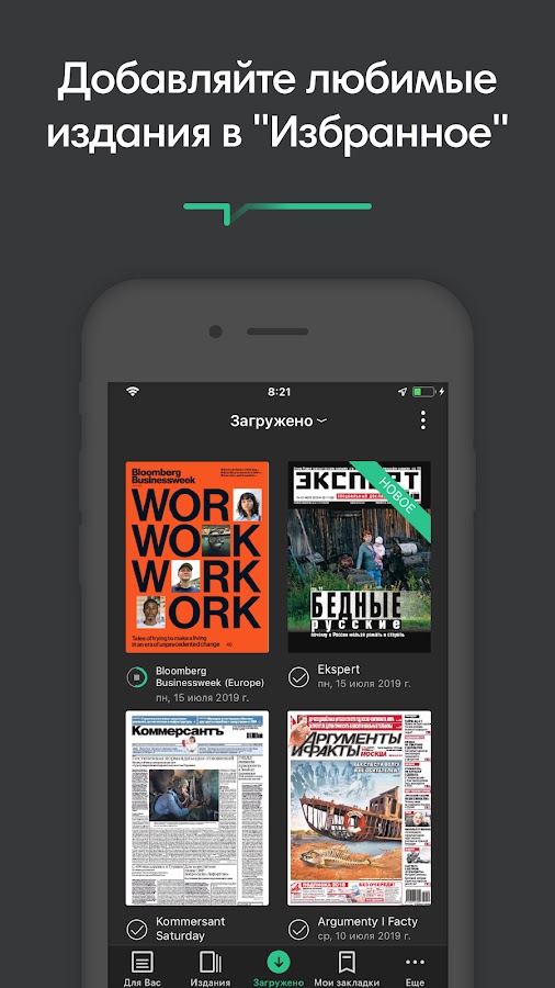 Загружайте полные выпуски изданий для чтения без подключения к интернету или чтобы не расходовать свою квоту мобильных данных. Установите избранные издания на автоматическую загрузку чтобы ничего не пропустить.