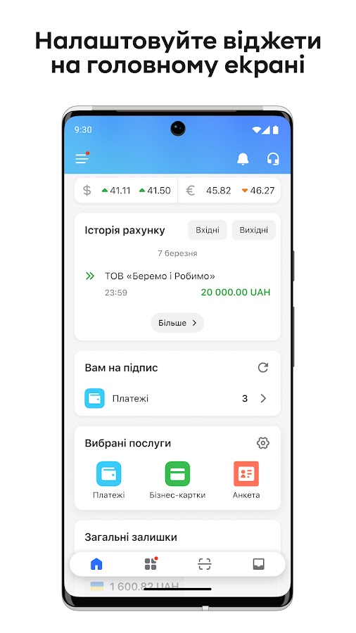 • Бизнес-карты: открывайте корпоративные карты, отслеживайте операции и устанавливайте лимиты.
