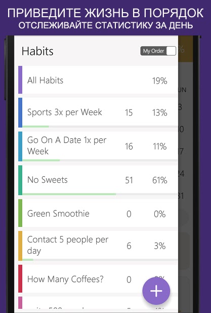 • Счетчик полос и процент успешных для каждой привычки