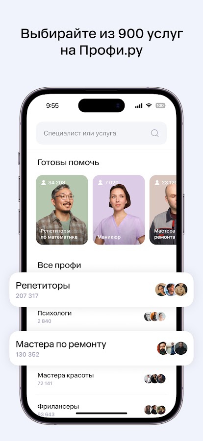 Профи.ру — сервис поиска специалистов и услуг. В приложении можно заказать уборку квартиры, найти психолога, записаться на маникюр, найти репетитора, чтобы подтянуть английский или подготовиться к ГИА, ОГЭ и ЕГЭ, найти мастера и договориться о ремонте в квартире.