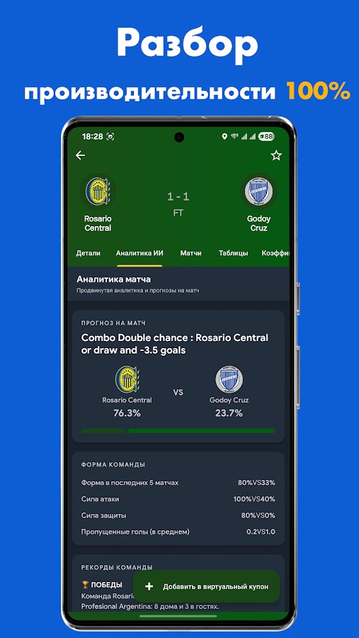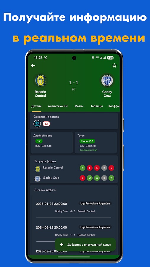 Лучшая в отрасли точность прогнозов – 87% Продвинутые алгоритмы, анализирующие более 200+ показателей игры