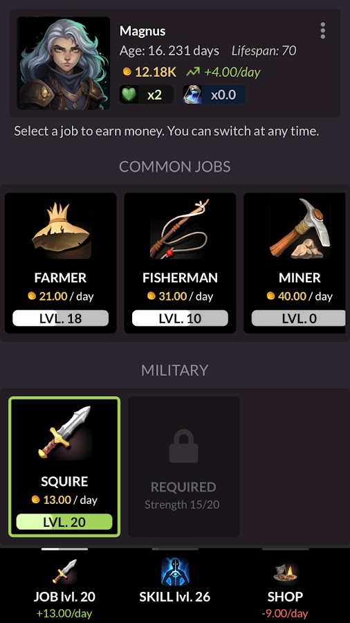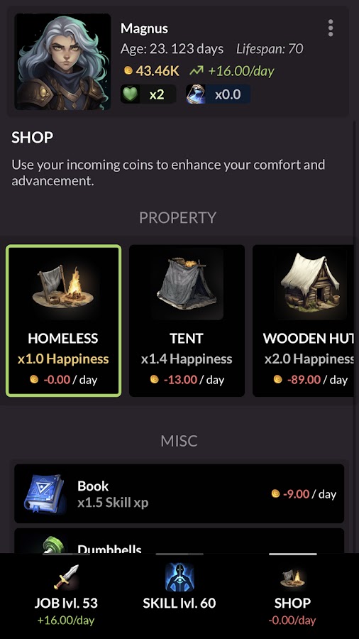 Сначала вы начинаете как нищий, едва способный прокормить себя с течением времени. Однако с годами вы осваиваете новые навыки и получаете большой опыт работы, чтобы получить новую высокооплачиваемую работу, управляя своими расходами на проживание…