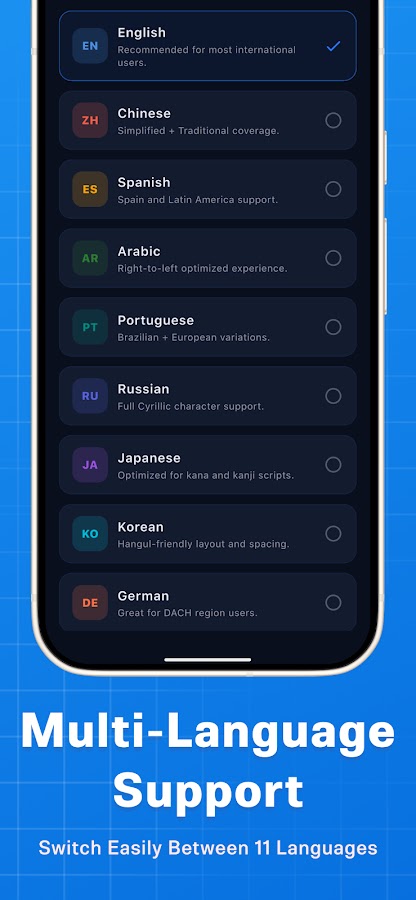 английский, китайский, испанский, арабский, португальский, русский, японский, корейский, немецкий, французский и польский.