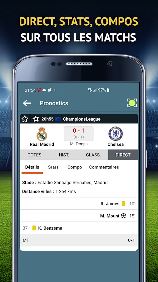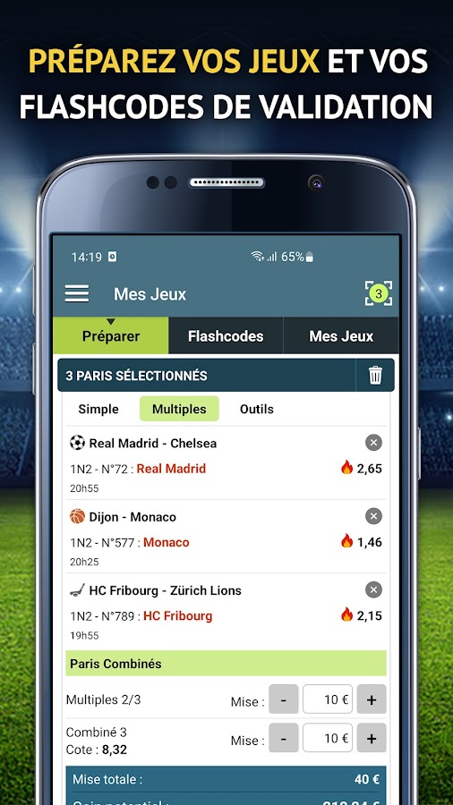 В дополнение к нашим прогнозам вы оцените исторические данные и турнирные таблицы каждой команды. Это позволит вам наилучшим образом подготовить свои ставки (с помощью QR-кодов подтверждения) и отслеживать результаты ваших прогнозов в режиме реального времени (в приложении или с помощью push-уведомлений).